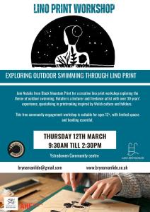 Dydd Iau 12 Mawrth: Archwilio Nofio Awyr Agored Trwy Lino Print 9.30am i 2.30pm yng Nghanolfan Gymunedol Ystradowen Digwyddiad ymgysylltu cymunedol am ddim • Oedran 12+ Rydym yn gyffrous
